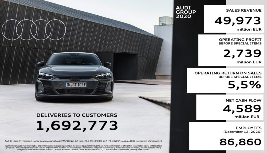 “Audi har mött utmaningarna med beslutsamhet under det gångna året och gjort allt för att komma stärkt ur krisen”, säger Markus Duesmann, CEO för AUDI AG. “De globala konsekvenserna av coronapandemin hade en avgörande påverkan på vårt räkenskapsår. Efter en global kollaps i efterfrågan på bilar, återkom stabiliteten senare under året – först i Kina, därefter i Europa och USA. Under det fjärde kvartalet kunde vi summera året med ett leveransrekord – som det mest framgångsrika kvartalet i företagets historia. Totalt intjänades en försäljningsmarginal före extraordinära poster på 5,5 procent under räkenskapsåret 2020. Prestationen är också resultatet av ansvarsfull krishantering under coronapandemin och framförallt en stark teamprestation. Jag är imponerad av förändringsviljan och flexibiliteten hos Audis medarbetare.”